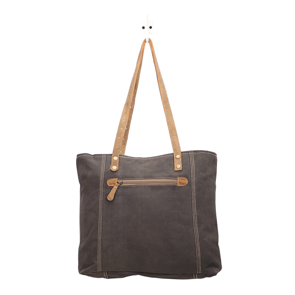 Floral print tote is made from upcycled canvas and includes real leather straps. Fully lined interior with 2 slip pockets and zipper pocket. Also includes back exterior zip pocket and zipper top closure.